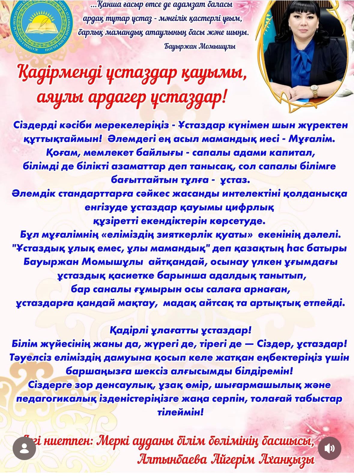 Білім бөлімінің басшысының құттықтауы