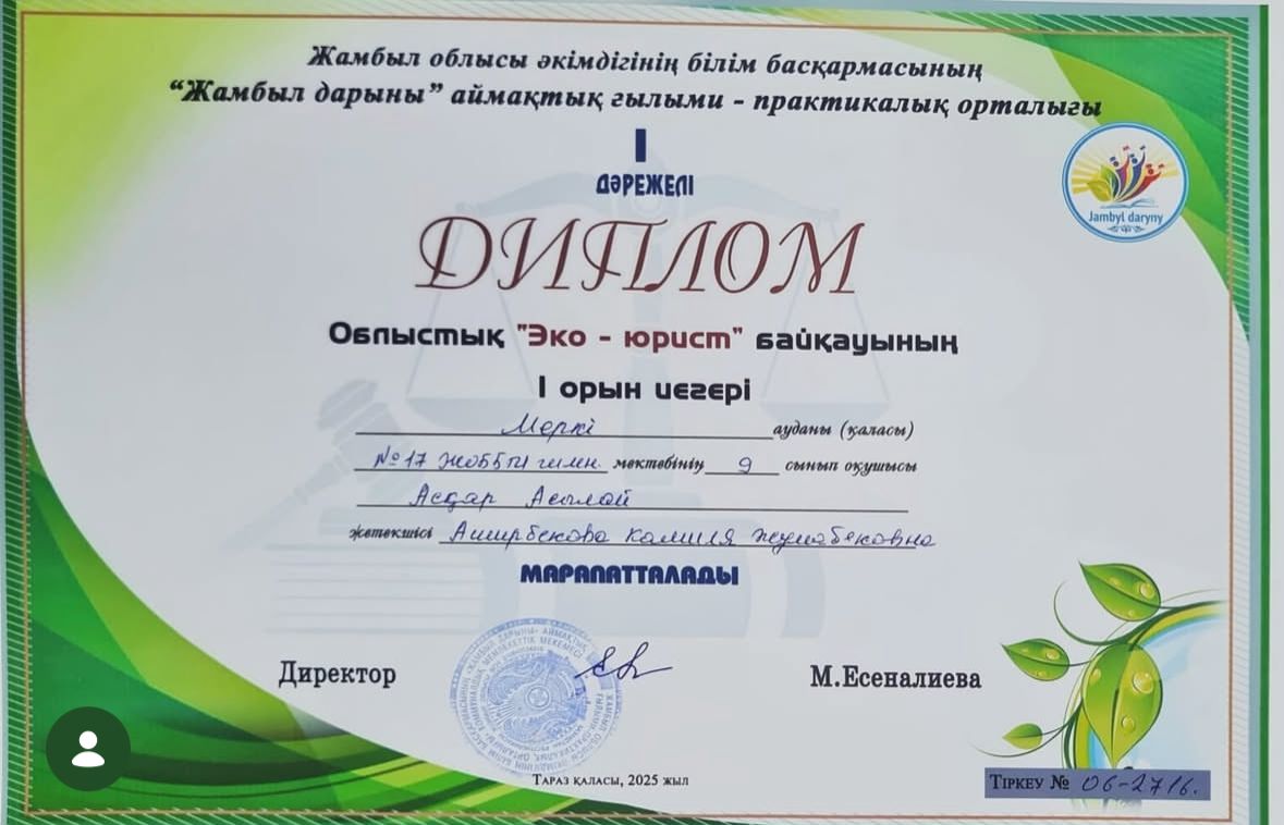 Меркі ауданының жас экологтары облыстық “Эко-юрист” байқауында 1-орынды иеленді! 🌿📚